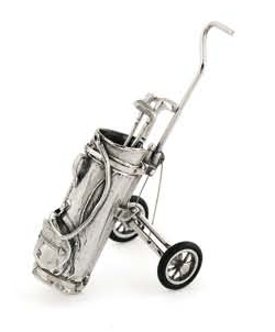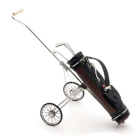 Carro de Golf de cuero. Complementos en plata de ley .Diseño Opera. Medidas 17 cm.