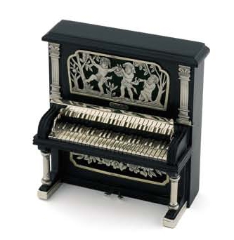 Piano vertical de ébano. Complementos en plata de ley.Diseño Opera . Medidas 10 cm.