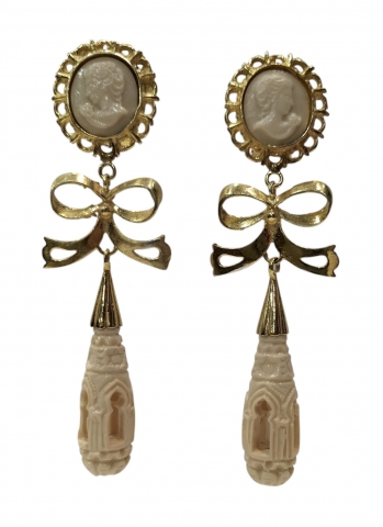 Mini cameo teardrop earrings with a bow, in sterling silver, gold plated and imitation bone. 7.5 x 2 cm.