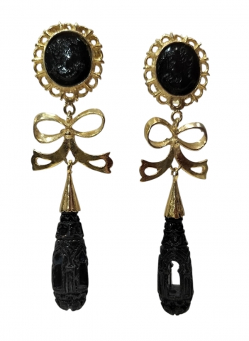 Mini cameo teardrop earrings with a bow, in sterling silver, gold plated and imitation ebony. 8 x 2.5 cm.