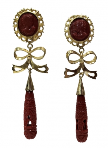 Mini cameo teardrop earrings with a bow, in sterling silver, gold plated and imitation coral. 8 x 2.5 cm.