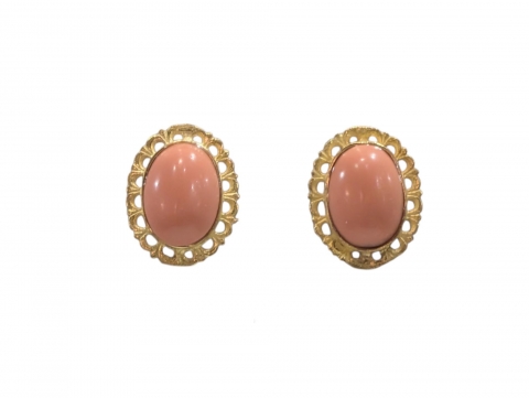 Pink coral oval earrings, made of gold-plated sterling silver. 1.8 x 1.4 cm. Push-button closure.