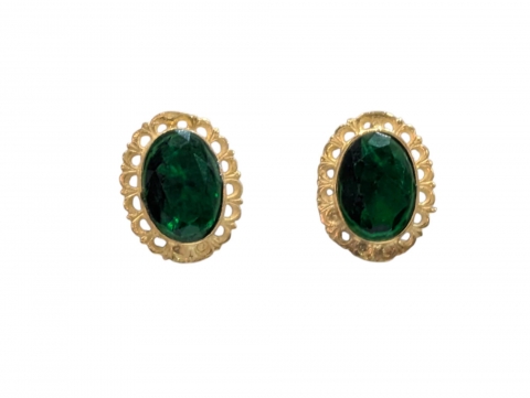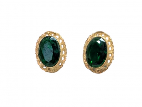Pendientes Ovalo con cristal verde, de plata de ley chapados en oro. Medidas 1.8 x 1.4 cm. Cierre Presión.