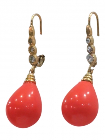 Red coral teardrop earrings, made of gold-plated sterling silver with imitation coral beads. Measures 4.8 x 1.4 cm. Rhinestone clasp.