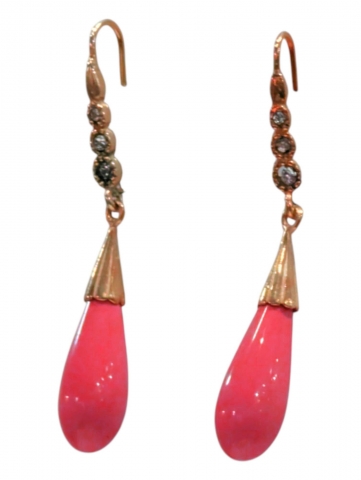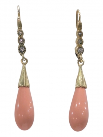 Pendientes lágrima color coral rosa, de plata de ley chapados en oro con chupones de imitación a coral. Medidas 4.8 x 1.4 cm. Cierre catalán con strass.