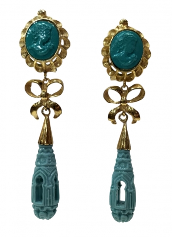 Mini cameo teardrop earrings with a bow, in sterling silver, gold plated and imitation turquoise. 7.5 x 2 cm.