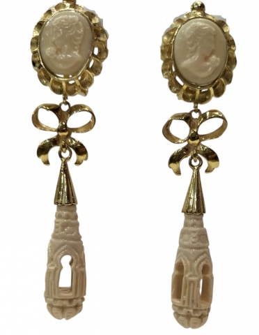 Mini cameo teardrop earrings with a bow, in sterling silver, gold plated and imitation bone. 8 x 2.5 cm.