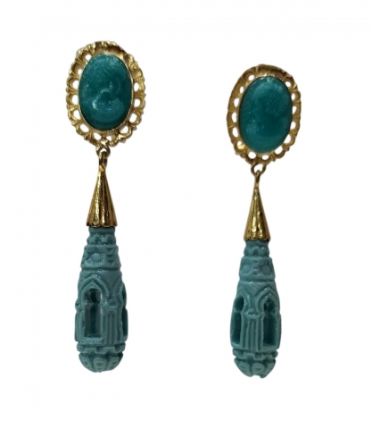 Mini cameo teardrop earrings, in sterling silver, gold plated and imitation turquoise. 6X1.2 cm.