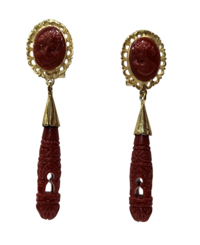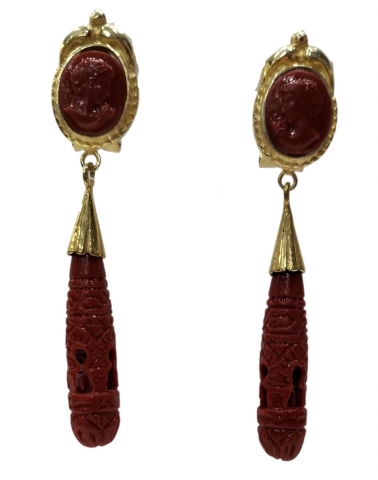Mini cameo teardrop earrings, in sterling silver, gold plated and imitation coral. 6X1.2 cm.