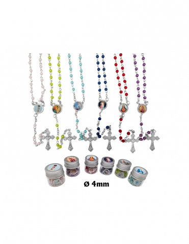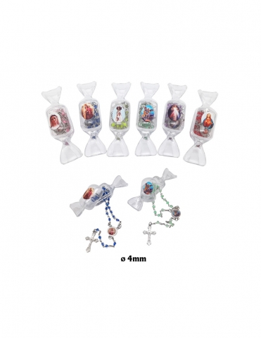 Rosario en 4mm de plástico, esmaltado en colores surtidos con tarro en forma de caramelo.