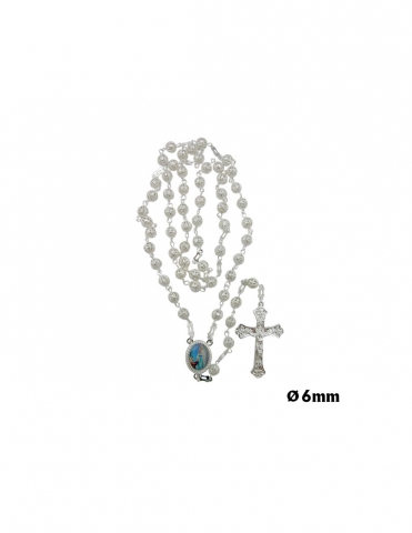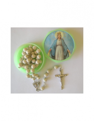 4mm smooth plastic rosary in a jar with a metallic cap.