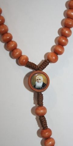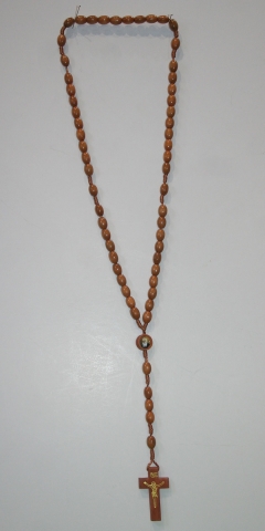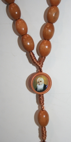 Rosario madera color claro con maría con la foto de Fray Leopoldo. Cuentas de barrilete de 6 mm Ø y 10 mm de largo.