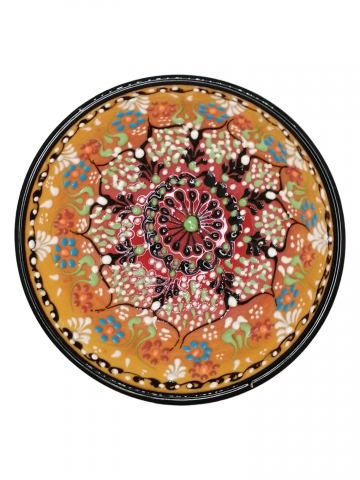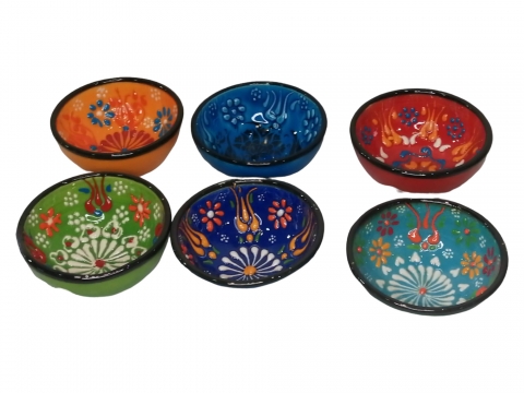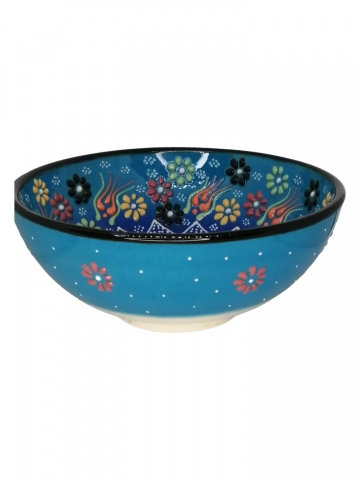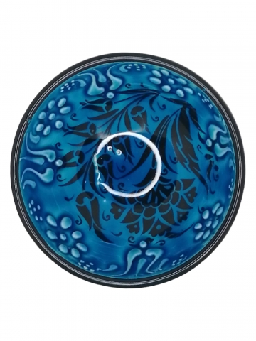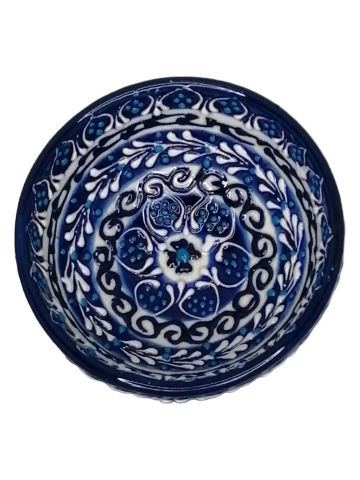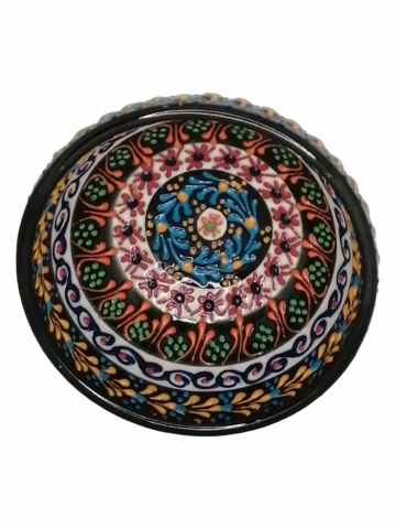 Ceramic bowl with relief, glazed and hand-decorated with plant or geometric motifs. Measures 8 cm and 3.5 cm high. Available in various colours and models. Extra finish: Relief finish.
