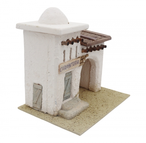 Hebrew house with dome and left window trusses for 5 cm figures. Measurements: (LxWxH): 13x11x15.5 cm. Made of wood. Photo is for guidance only due to the handmade nature of the piece.
