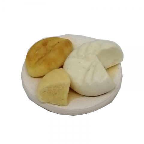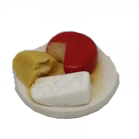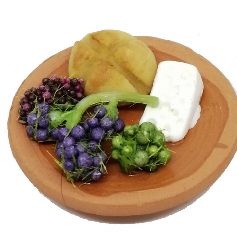 Plate Model A: Bread with cheese and grapes. Measurements Plate 5 mm height and 3.6 cm Ø.