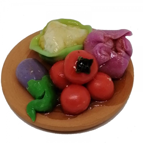 Plato Modelo E: Verduras: Coliflor, Berenjena, Remolacha y Tomates . Medidas Plato 5 mm altura y 3.6 cm Ø .