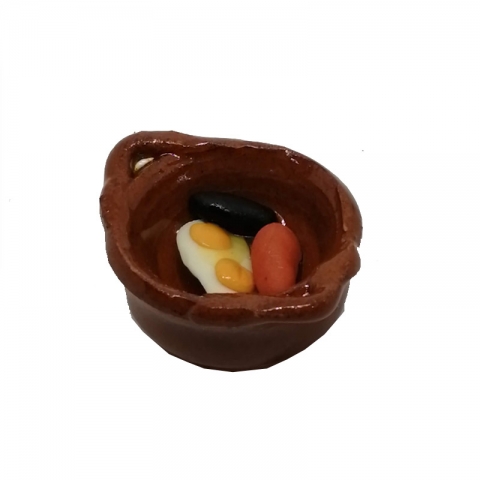 Clay paella pan. Pan dimensions: 6.5 cm long and 4.5 cm diameter x 2 cm high.