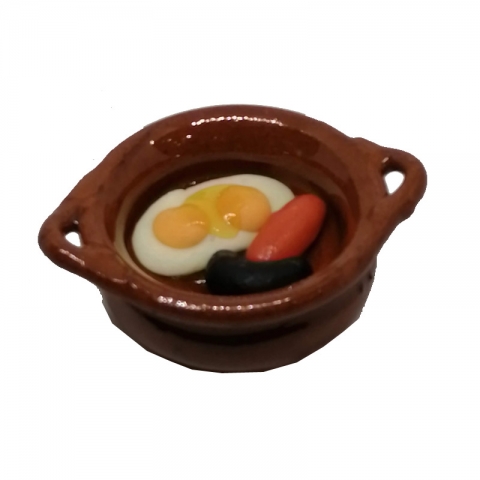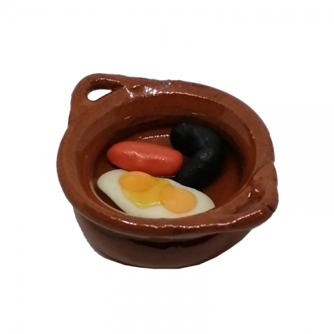 Plato Huevos fritos con chorizo y morcilla en barro. Medidas Plato 8 mm altura y 3.3 cm Ø .