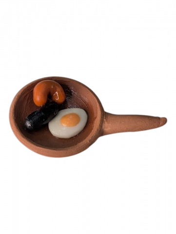 Sartén de barro con morcilla , chorizo y huevos. Medidas sartén 4.5 cm largo ext y 2.5 Ø x 1 cm h.