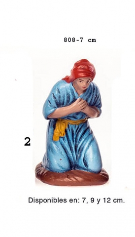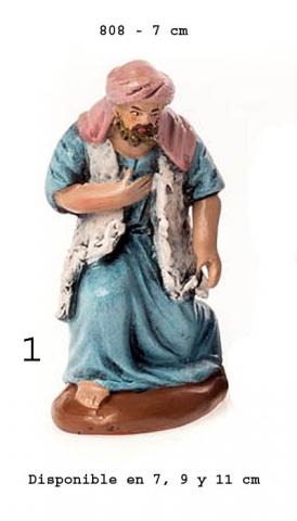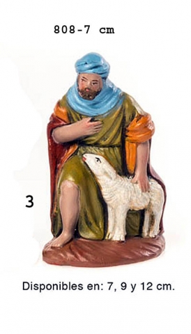 Pastor con oveja adorando de estilo Samaritano en barro lienzado, serie 800. Realizado por Figuralia. Foto orientativa debido al carácter artesanal de la pieza.