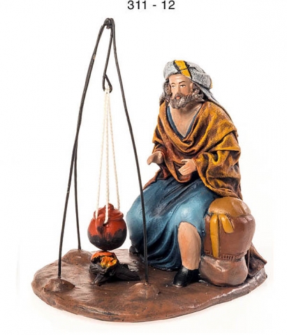 Modelo 311: Grupo Pastor calentándose en la hoguera. Pastores de estilo samaritano, de barro enlienzado, serie 300. Realizado por figuralia en 12 cm. Foto orientativa debido al carácter artesanal de la pieza.