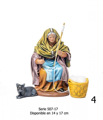 Model 4: Old shepherdess group spinning with a cat. Group of shepherds in Salzillo style in linen cloth, series 500. Made by figuralia. Orientative photo due to the handmade character of the piece.