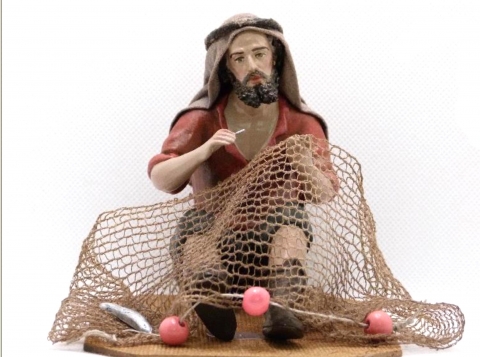 Shepherd repairing his nets in polychrome clay and canvas from Belenes Galán. Available in various sizes.