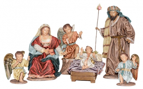 Nativity (without angel), made of clay and canvas.Available in various sizes.