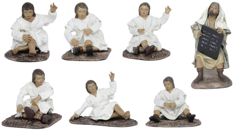 Set of children with teacher in 12 cm, made in mud and linen cloth.