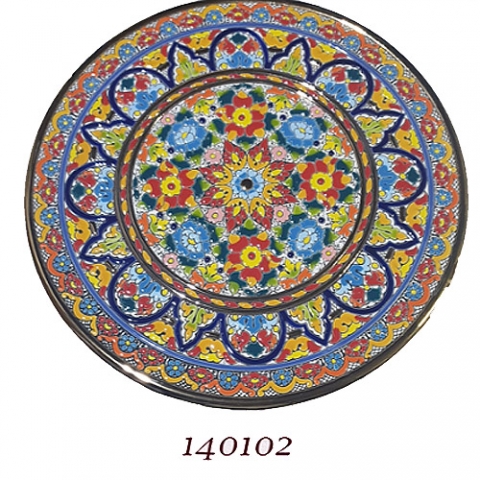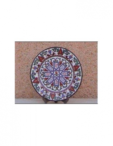 Plato cuerda seca realizado en esmaltes cerámicos y oro de 24 quilates de 40 cm Ø. Foto orientativa ya que debido al carácter artesano pueden variar los colores.