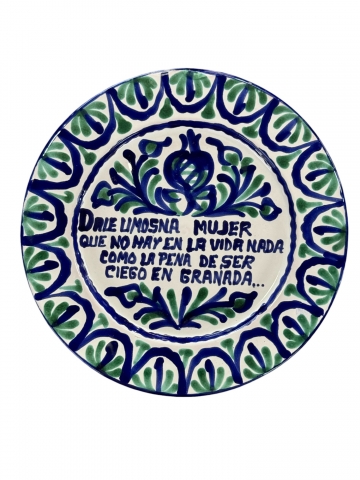 Fajalauza Plate (Granada ceramics.) Decoration Saying "Give alms woman, there is nothing in life like the penalty of being blind in Granada. Available in various sizes.