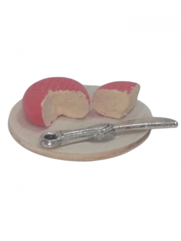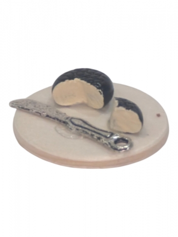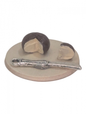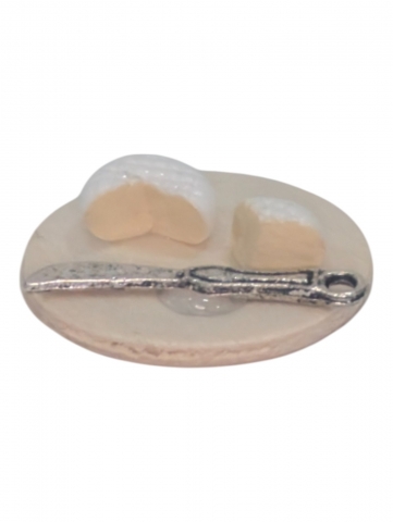 Ceramic plate with cheese and knife. 2.5 cm diameter plate.