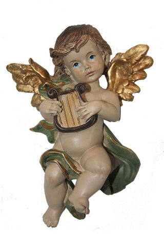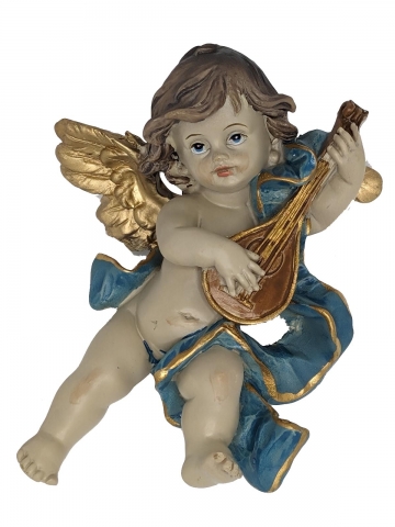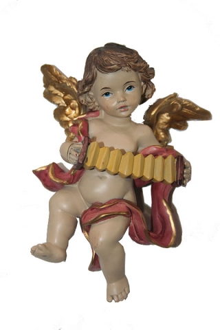 Group of four musical angels to hang in polychrome resin of 15 cm. Measures: 11x6x15 cm.