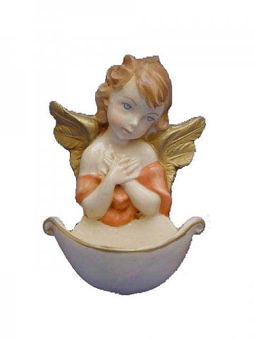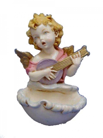 Blessed water container with angel playing the mandolin, porcelain finishing. Figure in resin, 16 cms.