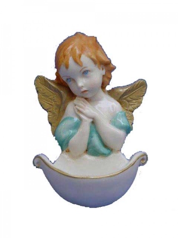 Blessed water container with blue praying angel, porcelain finishing. Figure in resin, 13 cms.