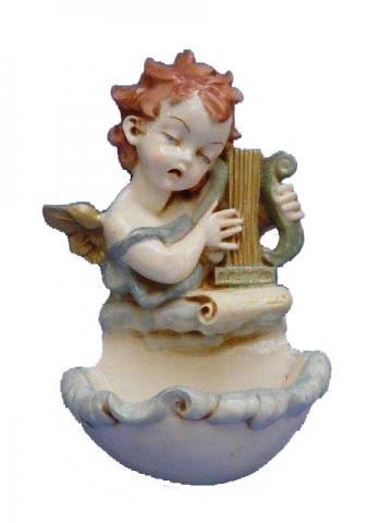 Blessed water container with angel playing the lira, porcelain finishing. Figure in resin, 16 cms.