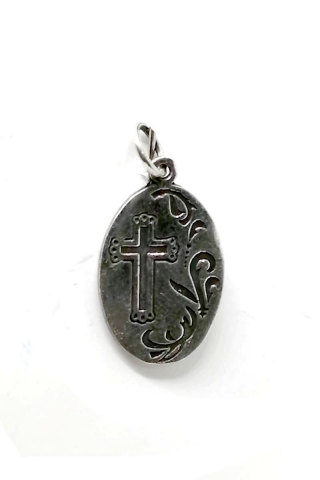 Saint Pancras oxidized silver medal. Measurements: Length 27 mm x Width 15 mm. Metal: Sterling silver 925 thousandths.