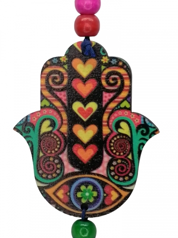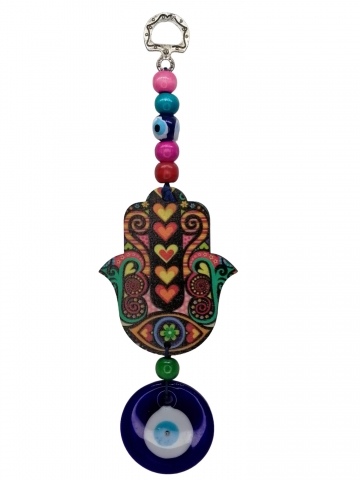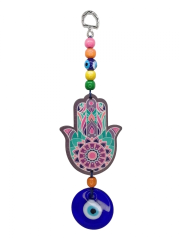 Hanging Hamsa amulet made of glass with Turkish evil eye. Measurements: 20 cm long, 4 cm Ø.
