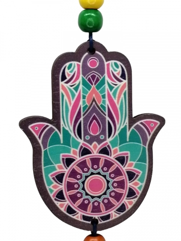 Amuleto Hamsa de cristal con ojo tuco para colgar. Medidas: 20 cm largo, 4 cm Ø.