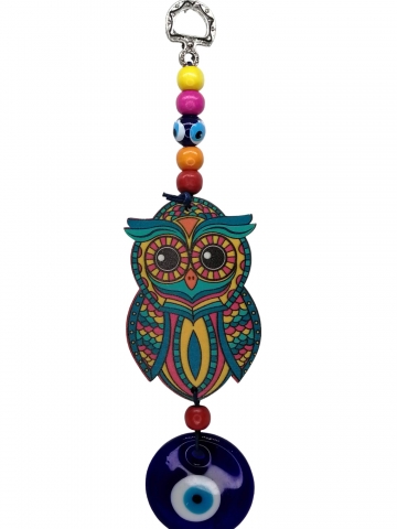Hanging crystal owl amulet with Turkish eye. Measurements: 20 cm long, 4 cm Ø.