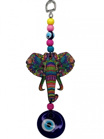 Hanging glass elephant amulet with Turkish eye. Measurements: 20 cm long, 4 cm Ø.