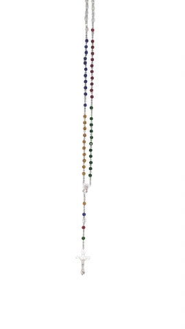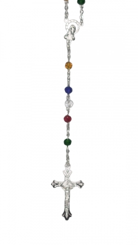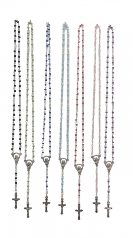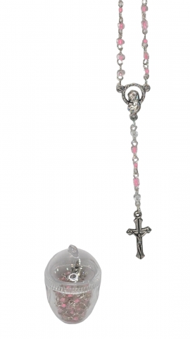Mini glass rosaries. Available in various colors. Approximate length 32 cm and 3 mm Ø. They come in a small plastic egg-shaped box.