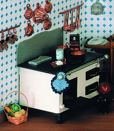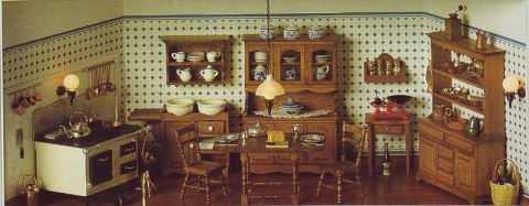 Kitchen set that contains 9 pieces of furniture, coal stove, 4 cake tins, 3 pots, 2 bowls, spice rack and wallpaper.