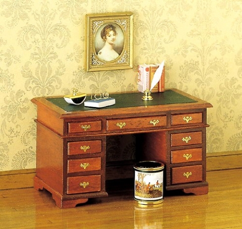 Mesa despacho de madera con superficie en piel real, (sobre 1760) Medidas: 6.5x11x6 cm. TIPO KIT, PARA MONTAR.