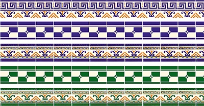 Frieze for wall tiles. 5 different patterns, 6 strips per pattern, 29 cm long, printed on high-sheen cardboard.