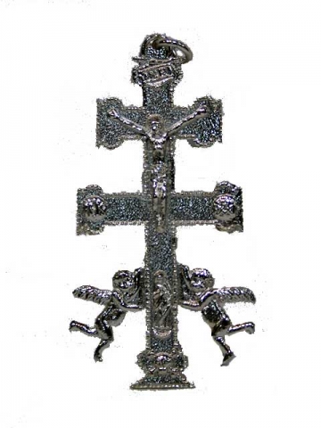 Cruz de Caravaca en metal plateado. Medidas: 11.50 cm.