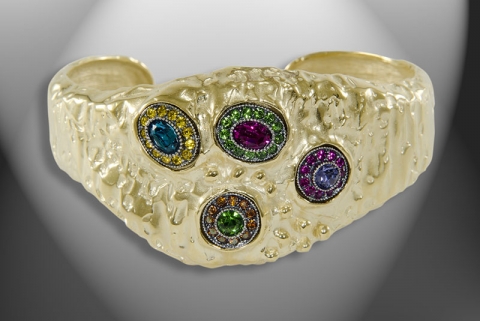 Pulsera en plata de ley con cristales de Swarovski y acabado en oro . Diseño de Máximo Betro.