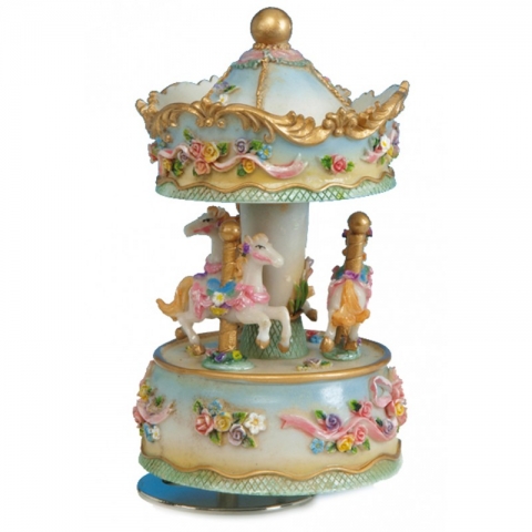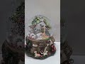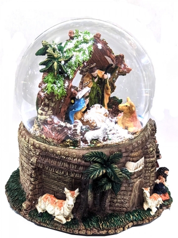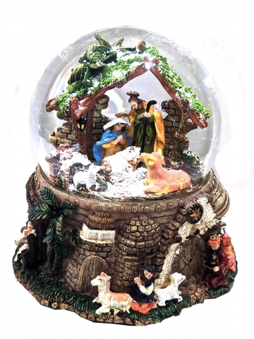 This large snow globe is about 20 cm high and 20 cm in diameter with a nativity scene and the base decorated with the wise men, shepherds and animals. It works manually or with a rope that activates the lights, snow and sound.