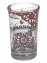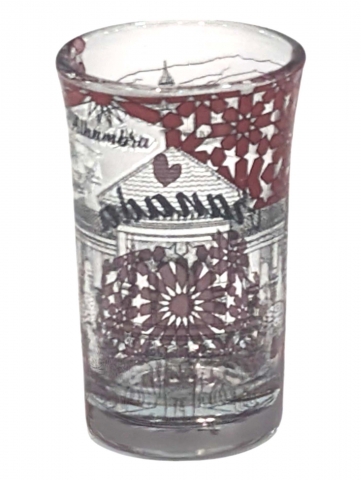 Clear glass shot glass with polychrome and Granada motifs. Measures 6 x 5 cm.