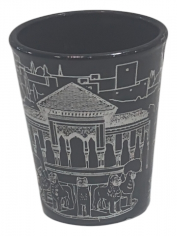 Black glass shot glass with Granada motifs.